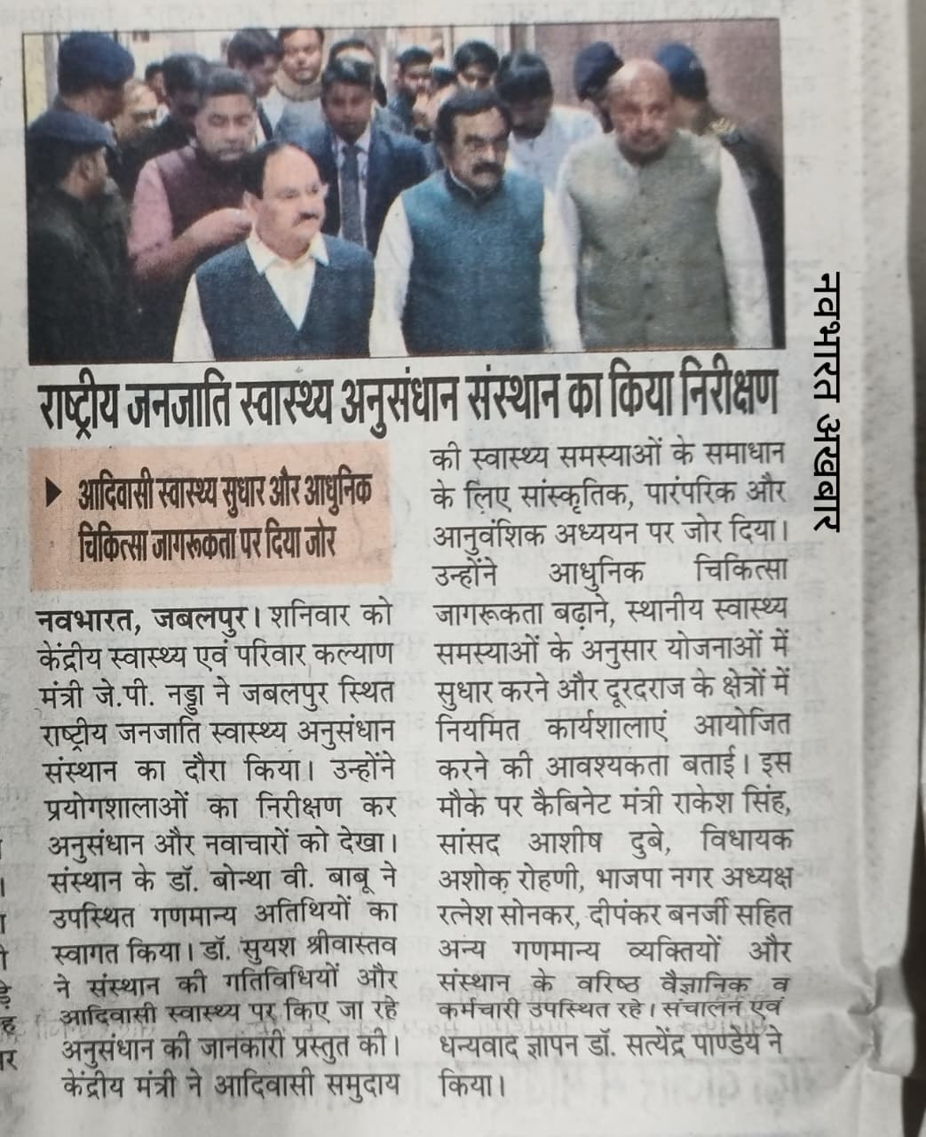Union Health Minister Shri J.P. Nadda urges scientists and researchers to improve tribal health outcomes by studying indigenous practices, traditions, genetic diversity and local healthcare systems during his visit to ICMR–national institute of research in tribal health, jabalpur (date: 24/01/2026)